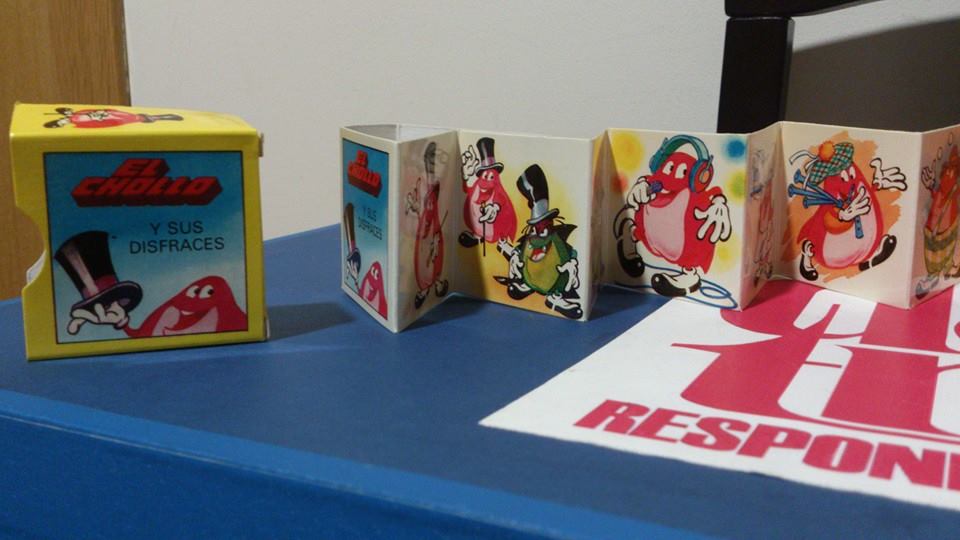 Cual ha sido mi sorpresa al descubrir en una visita a mi hermano que trabaja en una librería en Cádiz llamada RAIMUNDO, uno de los muchos prodctos que sacaba el programa como parte de su extenso merchandising. Se trata de un cajita muy pequeña que guarda en forma de tira un total de veintidós fotos (un número muy del programa) con los diferentes disfraces del Chollo. Algo muy curioso y que por solo 0.50 euros, he podido adquirir para ampliar un poco más mi colección de objetos del programa.
